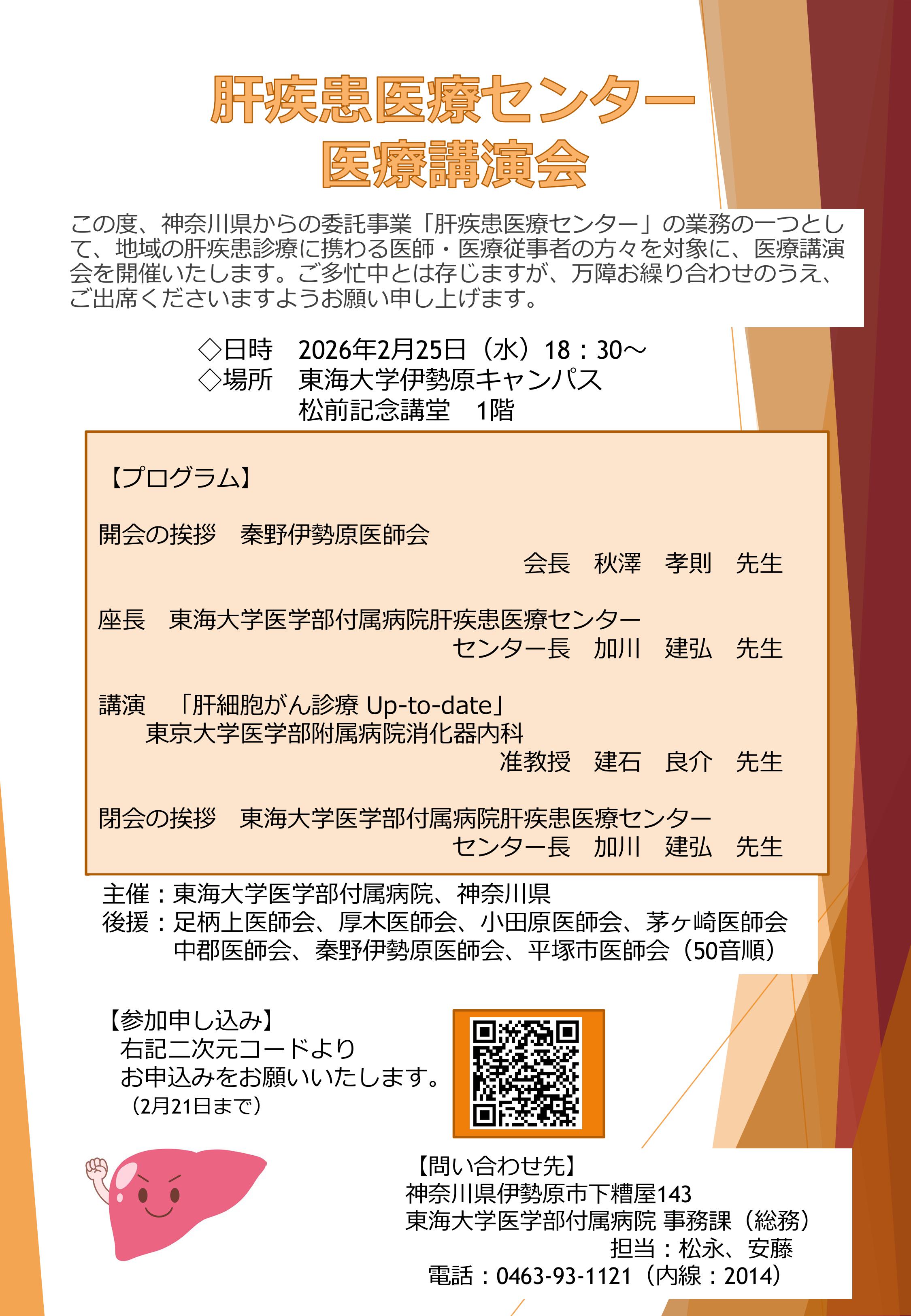 | みんなの肝臓病講座 | 肝疾患の患者さんとご家族(当院に通院していない方も含む)、 及び保健医療福祉関係職の方を対象とします。 *会場:病院棟(5号館) 5階会議室 |